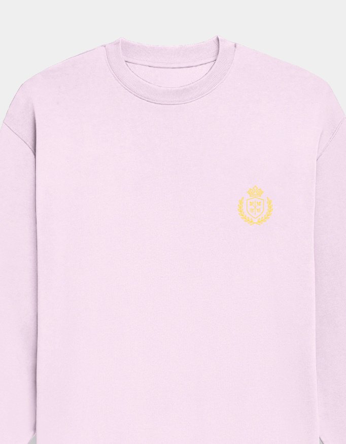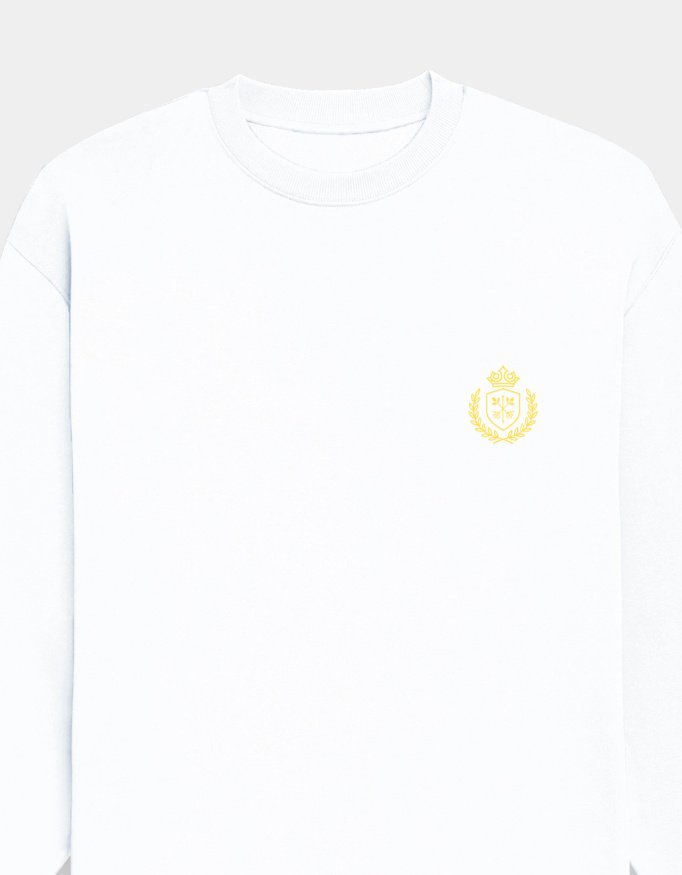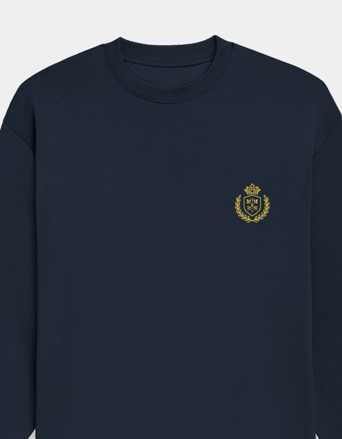 Crafted with a premium 90% cotton, 10% polyester blend, it’s bio-washed for softness but engineered for structure. The oversized fit maintains architectural balance across the shoulders and body, while ribbed hems and cuffs anchor the shape. A golden embroidered emblem over the heart adds a final note of quiet authority.